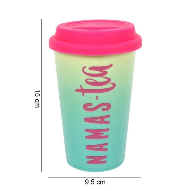 Bright and colourful double wall ceramic thermal travel mug featuring 'Namas-tea' design. Complete with insulated rubber lid.